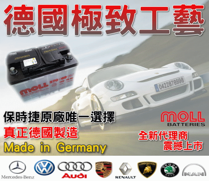 德國MOLL電池.為歐洲車系大廠選配為最佳跑車電池.柴油渦輪增壓.汽油渦輪增壓.高熱引擎系列轎跑車原廠配備電池.絕佳耐熱設計.壽命超越德國華達與德國雙樹30%以上!